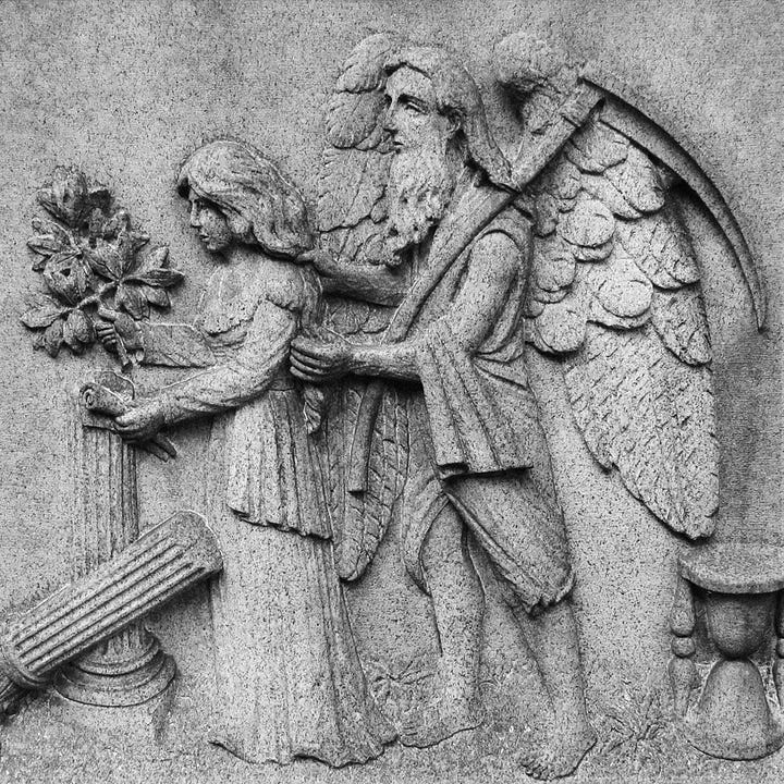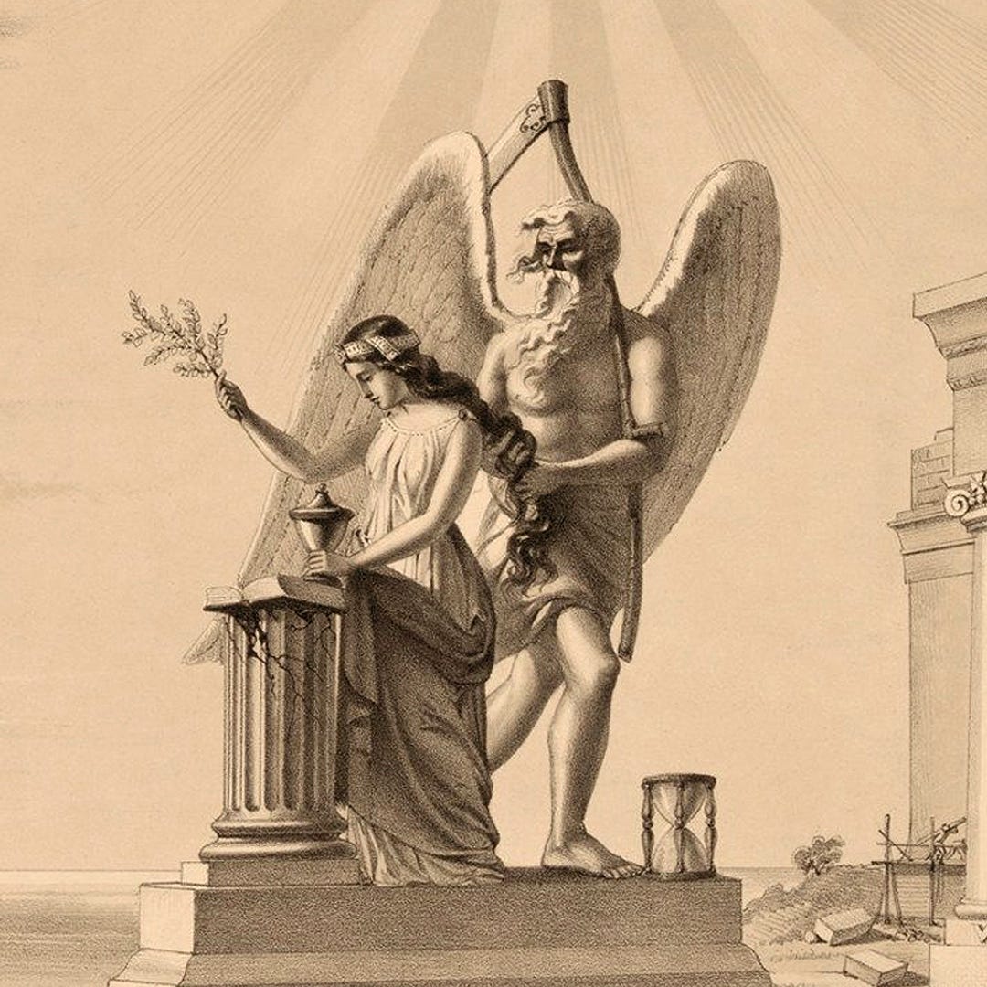 Every Virgo season I’m reminded of the Weeping Virgin motif from Freemasonry. This scene depicts Father Time holding, untangling or gazing into a young maiden’s disheveled hair. Symbolically, the woman represents Virgo and the old man is Saturn. To Freemasons, the Virgin is mourning the death of Hiram Abiff, the chief architect of King Solomon’s Temple.