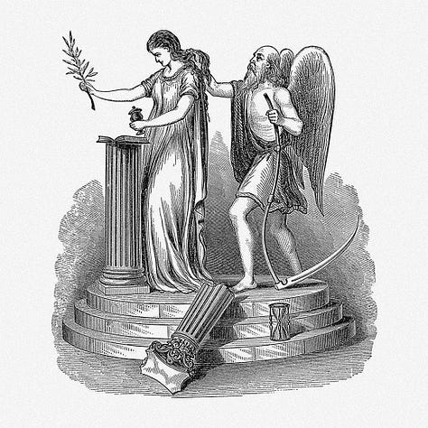 A complete pillar represents structure and order while a broken pillar represents destruction and chaos. Naturally, the passage of time both heals and destroys. Eventually, Father Time comes for all and for Virgo this includes her virgin born child.